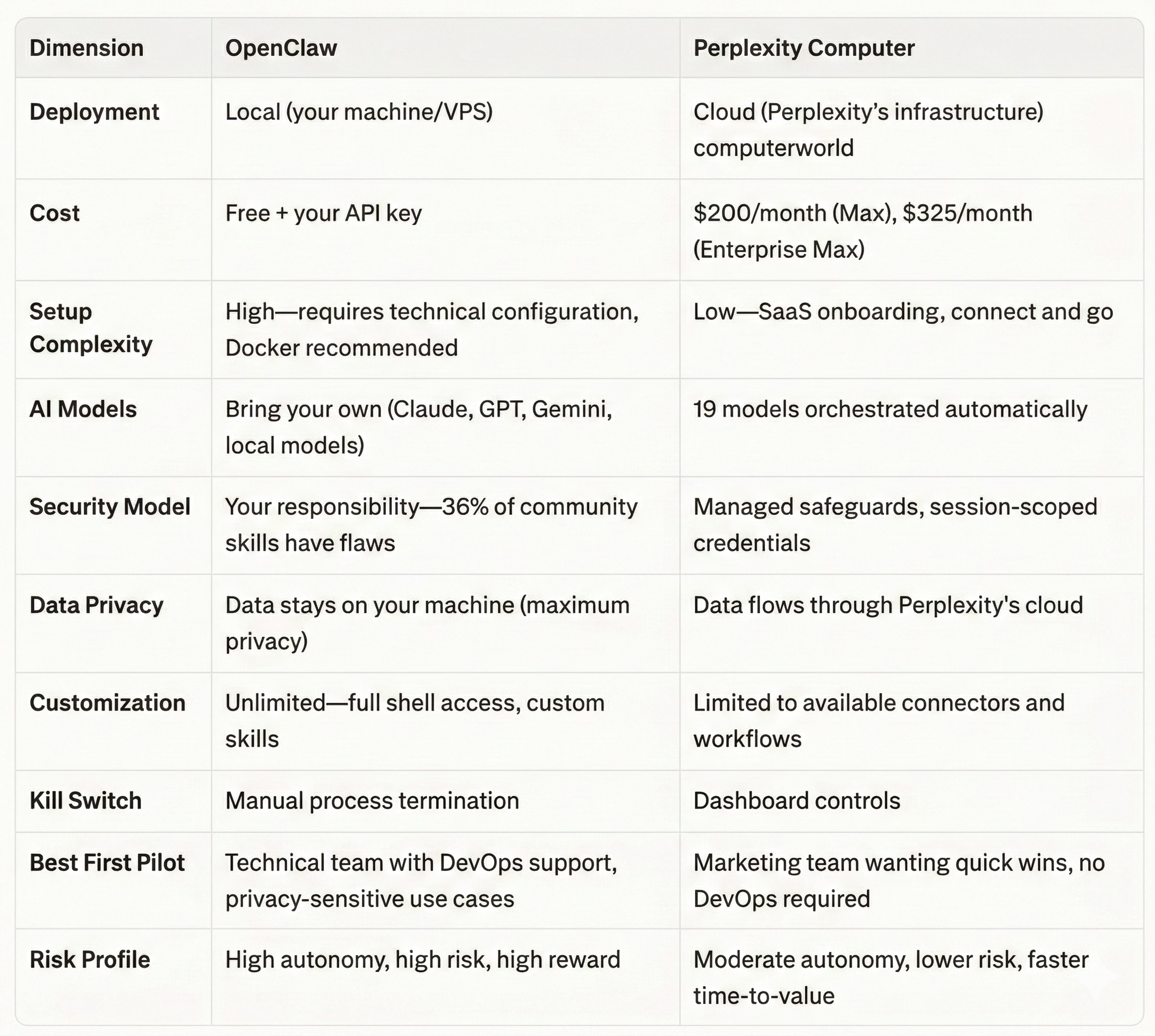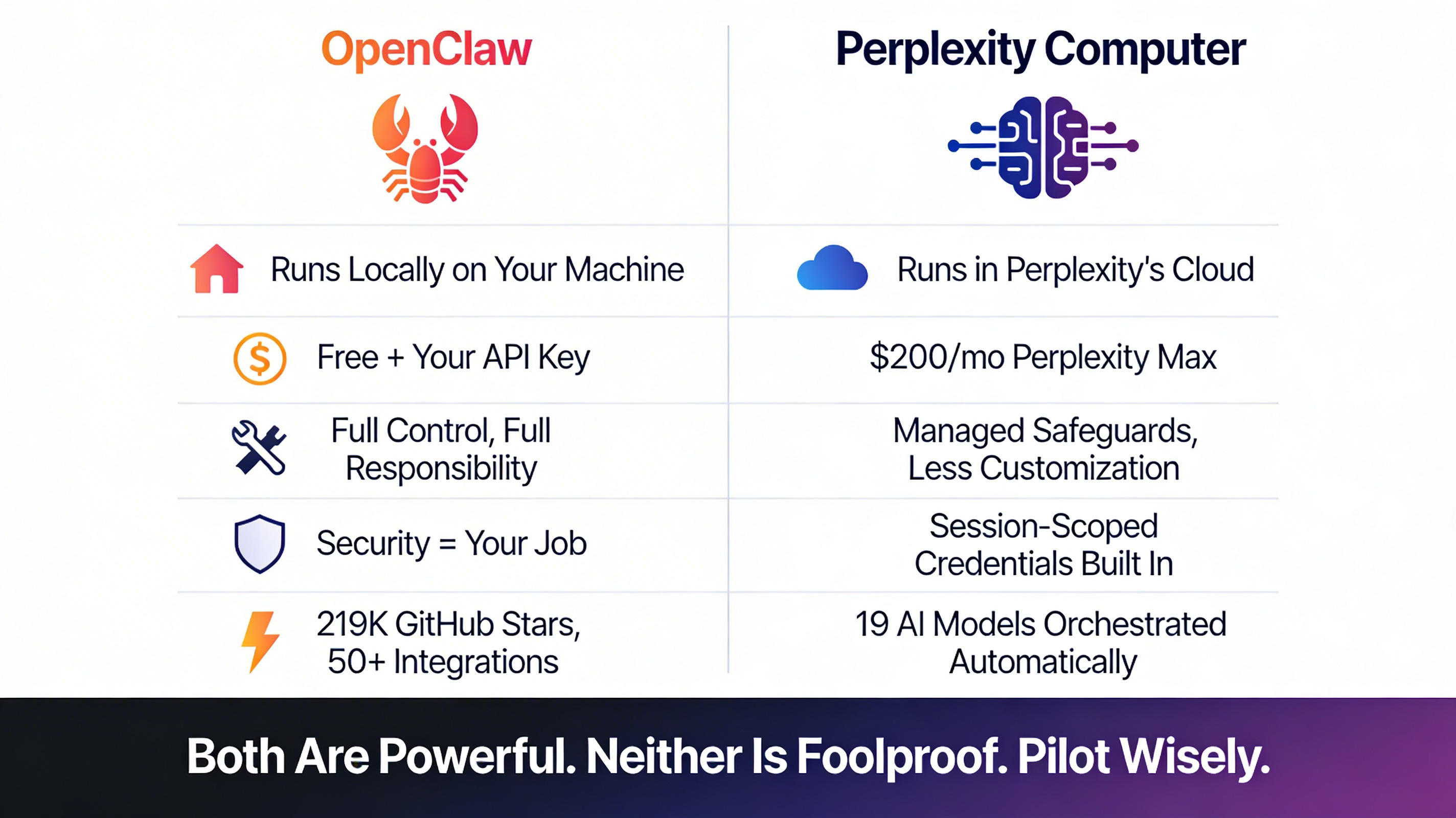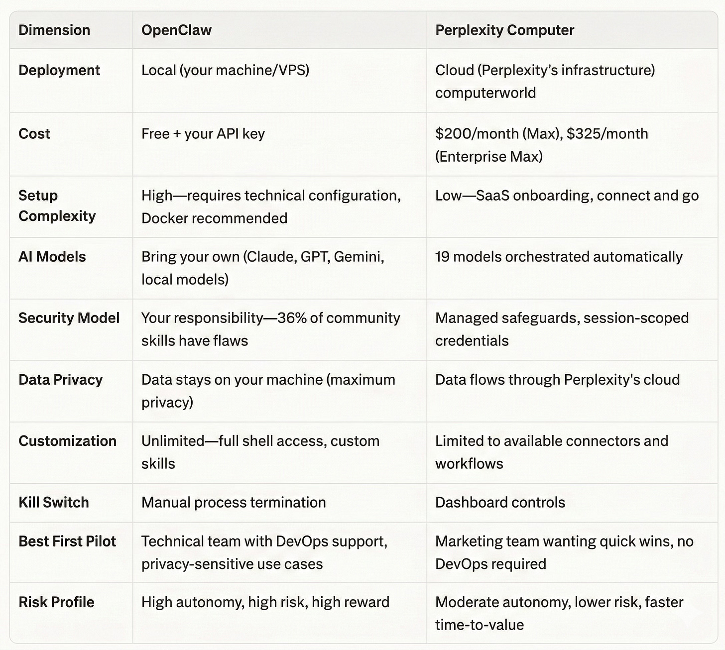Perplexity Computer = cloud-managed, turnkey orchestration, safer by design, less customizable, $200/month